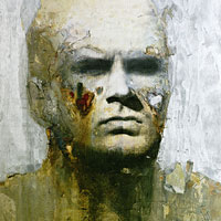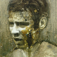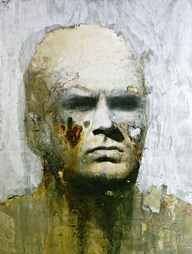 Paper and paint were layered on wood panels, torn away; building up each image and eroding it at the same time.